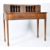 An early 20th Century Edwardian Carlton House manner ladies mahogany and walnut writing table desk having a gilt tooled cigarette brown writing skiver with sectional desk tidy back piece comprising a central bank of three small drawers flanked to either end by pigeon hole recesses and cupboard doors. All raised on tapering square legs. Measures: 101 cm x 103 cm x 53 cm.