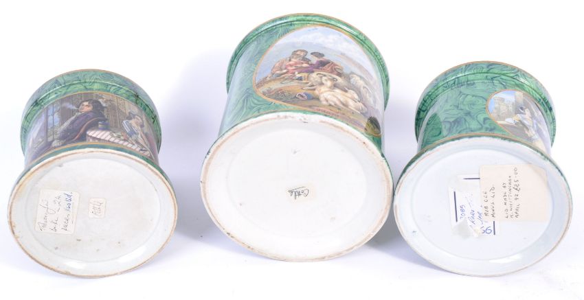 A collection of three 19th Century English antique prattware Tobacco pots all having green malachite and gilded decoration to include Passing The Pipe, Whittingham example and another.