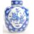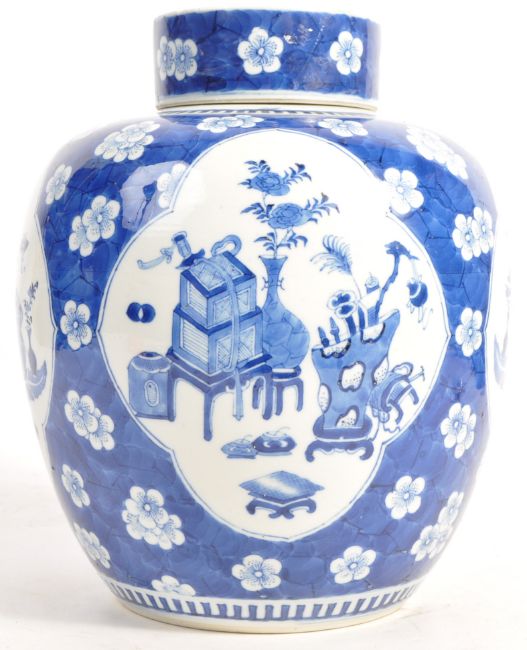 An early 19th Century Chinese antique porcelain ginger jar having blue and white hand painted decoration in the prunus pattern with large white cartouche panels depicting precious objects such as vases, scrolls, tables etc. Complete with matching cover or lid. Six character Kangxi reign mark to base in blue. Restoration to lid and body. Measures: 29cm tall.