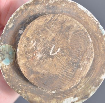 An antique 19th century Blue Faience ware stoneware Ancient Egyptian style canopic jar. The lid featuring the head of Anubis (dog), with various hieroglyphs to the body.  AF - some old repairs to nose and ear. Impressed monogram ' V ' to lid. Measures approx; 16cm tall.
