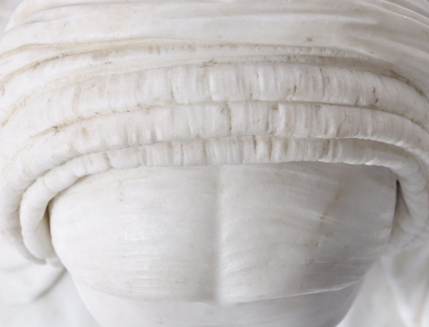 An 18th / 19th century marble bust of a lady in mourning. The elderly lady wearing mourning headwear set over a socle plinth base. Damage to nose. Measures 62cm x 26cma
