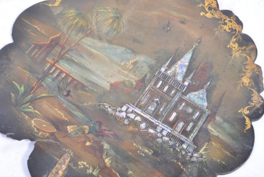 A pair of 19th Century antique paper mache face screens raised on gilded turned wood long handles. Each of scalloped form with scenes of building in abalone shell having hand painted detailing. Measures 43cm long.