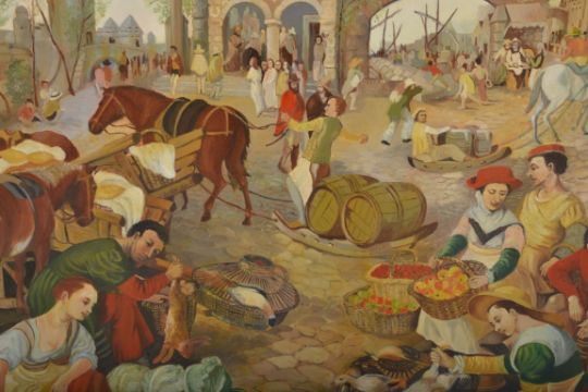 A vintage 20th Century lacquered oil on board painting depicting a busy Italian market scene. Unsigned. Set within a gilt frame. Measures 75cm tall by 60cm wide.