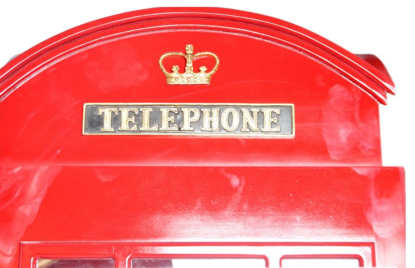A fantastic contemporary replica of the iconic British Red Telephone Box.  Incredibly well made replica from fibreglass, wood, and metal. Opening door to front, with ' Telephone ' signs to top. Fabulous 1/1 scale replica exhibition / events / advertising display prop. Measures approx 230cm tall. As new. Rare.