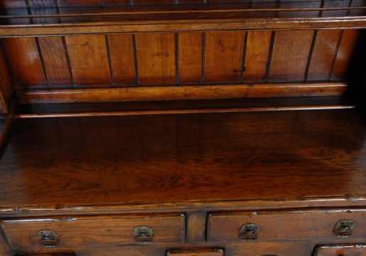 A good Georgian revival oak dresser. Of good small proportions, the base having an open recess with twin drawers to the top with brass ring handles and three small additional drawers below with a central turned support with a shelved open fronted top with carved shaped cornice to the top.
