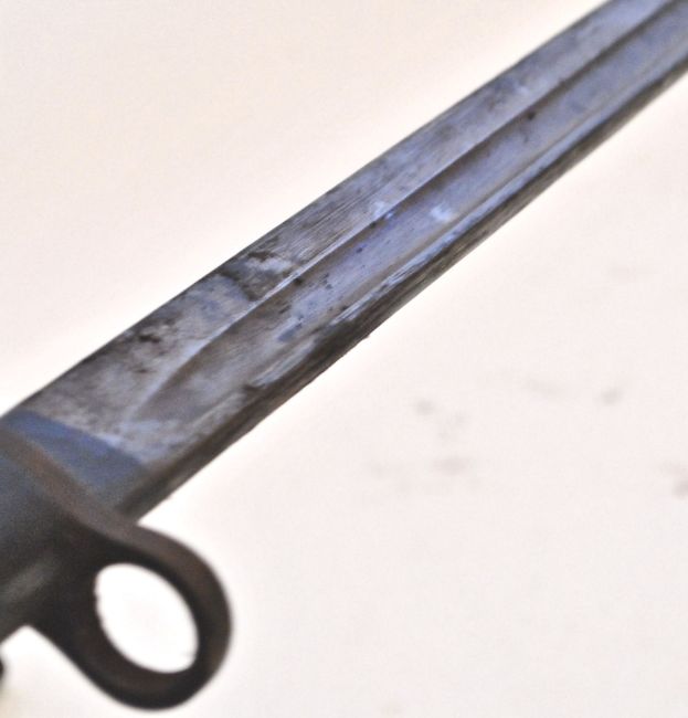 A rare WWI First World War British 1907 pattern Lee Enfield sword bayonet having shaped wooden grips, hooked steel pommel, press release stud, forward facing quillon, muzzle hole, long fullered steel single edged blade, Ricasso with royal cypher marks and 1907 to the other side along with a leather scabbard. Measures; 57cm in total.Note leather scabbard detached from steel throat.