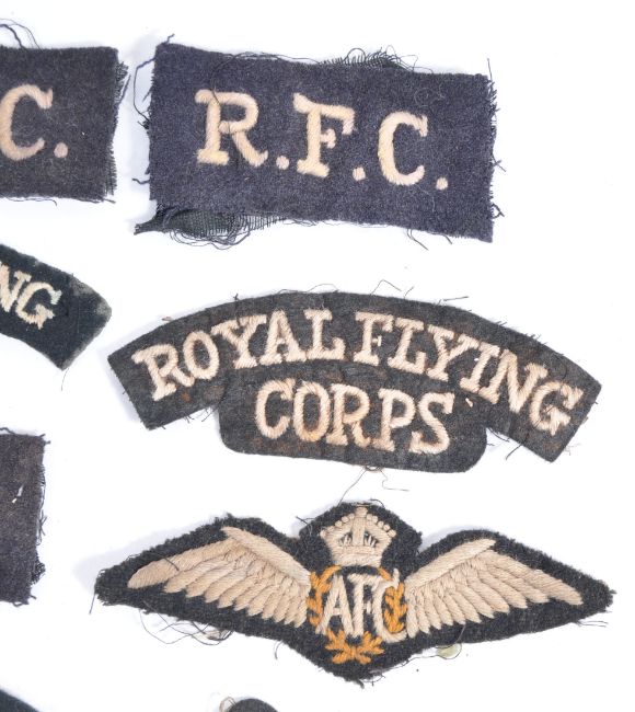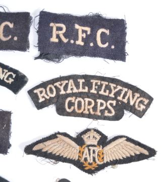 A good collection of x8 original WWI First World War era RFC Royal Flying Corps cloth uniform patches. One being a rare Australian Flying Corps patch. All with white / off-white embroidered lettering on black fabric. Great collection.