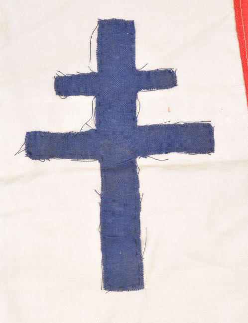 A rare original WWII Second World War related French flag - the flag being ' defaced ' with a French Resistance movement emblem crudely stitched to centre. Makers marks to seam faintly visible. Measures approx; 42 x 70cm.