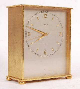 A 1970's retro vintage Garrard Precision mantle clock presented to K H Varty from the Directors Of Esso Petroleum Co. Ltd for 25 Years Service. The clock of gilt brass contribution with glaze panel front. Silvered dial with gilt Arabic and baton numerals. All raise on four small gilt bun feet. Measures 16cm tall.