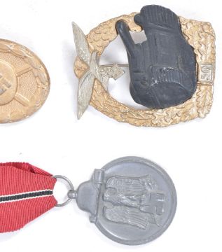 A collection of x6 replica WWII Second World War Third Reich Nazi German Army badges and medals, to include; an oversized WWII Iron Cross (2nd Class) with ribbon, an ' Afrikakorps ' tally band, a gold level Wound Badge, Panzer badge, a 1941 ' Eastern Medal ' ( Im Osten ), and bronze level Close Combat Clasp. All highly detailed replicas, with makers marks to reverse.