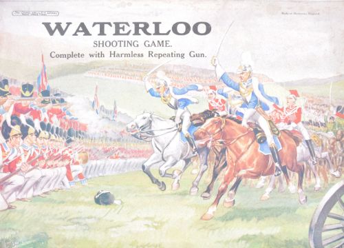 A scarce original vintage 1940's Chad Valley made military based ' Waterloo - Shooting Game '. The game featuring a set of wooden soldiers, along with a ' Bandit Repeater ' rubber band gun. The gun of metal construction. Instructions to underside of lid. Boxed. Rare game.