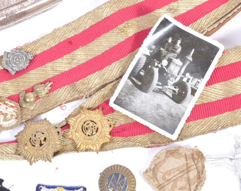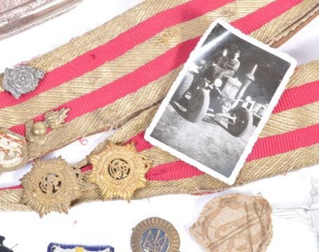 A collection of assorted militaria - WWI and WWII Second World War related military items, to include; a uniform sash, various cloth cap badges, uniform patches, a Parachute Regiment cap badge, an 'economy' King's Own Royal Rifle Corps badge, Royal Dublin Fusiliers badge and other items.