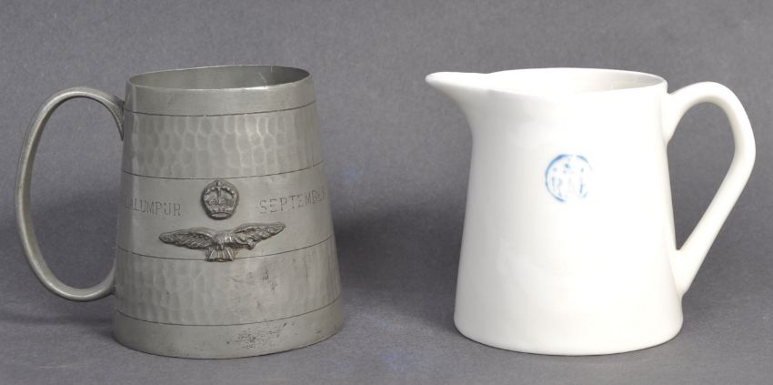 A rare original WWII Second World War RAF Royal Air Force related presentation pewter tankard. The tankard engraved to front ' Kuala Lumpur September 1945 ' and features the RAF eagle and crown, the reverse engraved for an ' F. Taylor - 154 S. P. RAF '. Presumed to be that of 154 Squadron. Makers marks to base for Malaya. A rare piece of RAF history. Measures approx; 11cm tall.