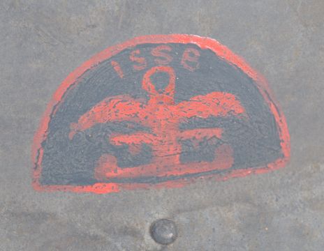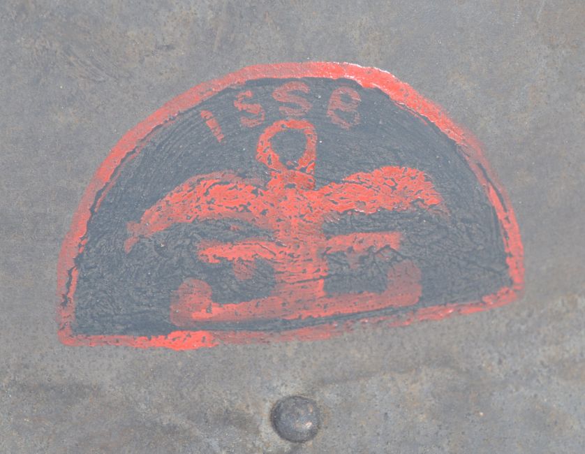 A rare original WWII Second World War steel Brodie helmet. The helmet with a painted emblem to side for ISSB in red and black. The helmet a complete example with liner and chin strap present. Stamped for makers ' BMB ' (Briggs Motor Bodies Ltd of Dagenham) and dated 1940. Rare helmet.