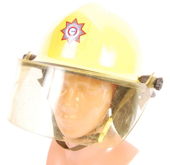 A Cairnes & Brother made N660C Metro Cellophane UCB Fire fireman's uniform helmet complete with all the straps, visor and lining.