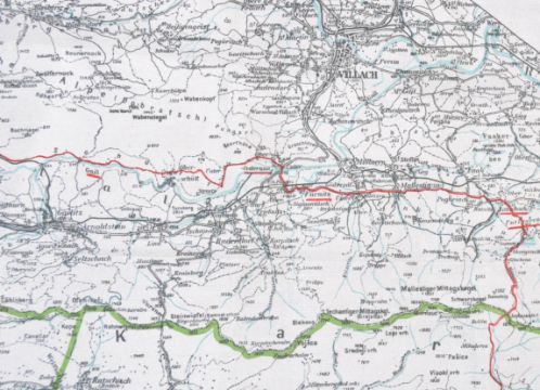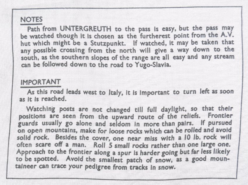 A WWII Second World War related silk ' escape ' map of ' Salzburg to Mojstrana '. Single sided, the map printed on silk. Undated. Marked as ' Most Secret ' to top corner, with a red line denoting the best route possible to follow, and frontiers marked in green. Measures approx; 56x52cm.