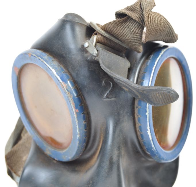A WWII Second World War German Nazi Third Reich M38 gas mask / respirator within metal canister with original webbing straps. The mask being a 2nd issue having black rubber with number 2 to the top, glass lenses with notation ' KUG 1942 Innenseite ', canvas straps and alloy snout marked ' HNR ' being manufactured by Apag. The filter being stamped with the Waffenamt mark and dated 1938. 28cm.