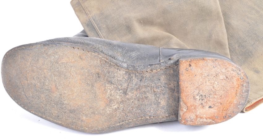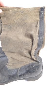 A rare pair of original WWII Second World War RAF Royal Air Force Flying Pilot Officer's leather and canvas boots. Well made boots, with canvas shin covers. The seam with faint makers marks and dated 1945. Size 11's. Rare boots.