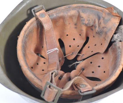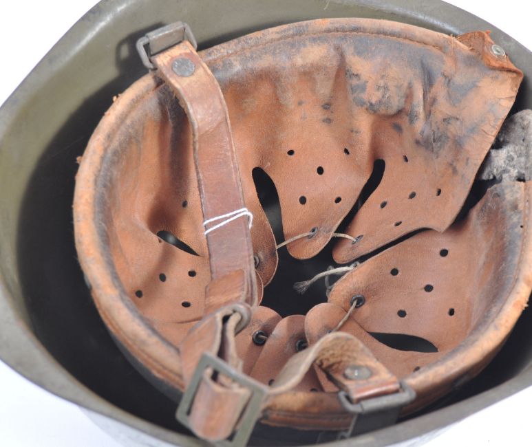 An original WWII Second World War era Russian Infantry soldier's helmet SSh-39. Steel construction, with original liner and leather chin strap present. Used example, and named by soldier to inside rim in pencil. Crossed daggers mark and ' 51 ' to interior of rim.