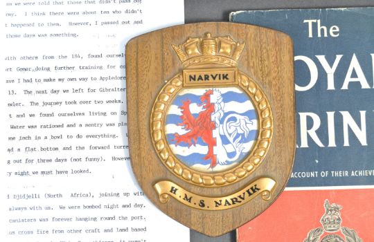 A number of WWII Second World War effects relating to a Royal Marine Commando, one Alan Rowcroft CHX 108811, comprising; his Fairbairn Sykes style commando dagger with original leather scabbard, his Chemical Spray anti-gas eye shield, an HMS Narvik wooden plaque, his folding jack knife, and various paperwork. Supplied with a typed history, as written by Rowcroft and a copy of a newspaper article. Interesting and unique collection.