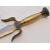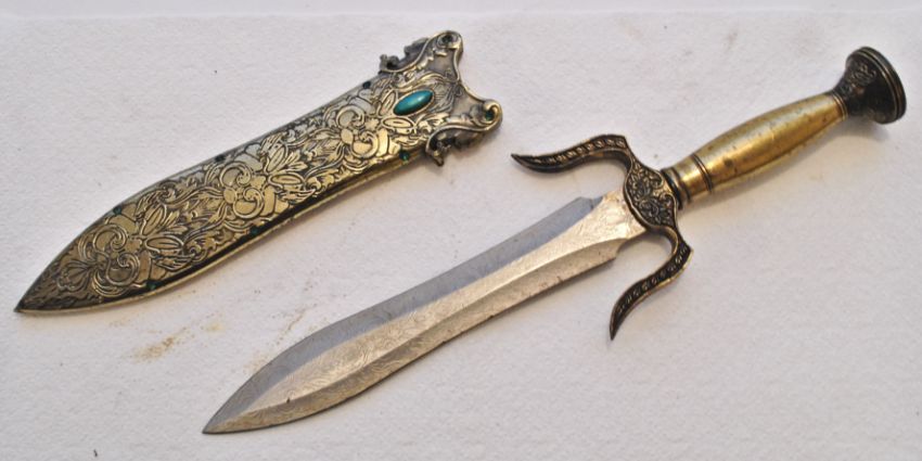 A 20th Century fantasy Chinese dagger having a brass handle with flared decorated pommel, double forward facing quillons, a shaped double edged blade along with a decorated brass scabbard with emerald green plastic jewell. Measures; 39cm.