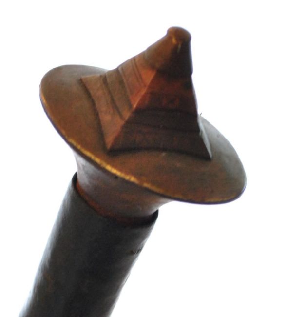 A Northwest African 19th century tribal Tuareg (Twareg or Tourareg) Takouba sword having a clad tooled leather handle of traditional form, wide oval pommel with pyramid end, steel double edged blade with crescent shaped detailing to both sides of the blade along with a tooled leather scabbard with decorated end. Measures; 86cm in total.