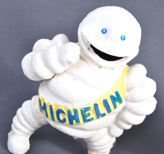 Michelin Tires - Bibendum - Two vintage style advertising point of sale automobIlia garage shop display cast iron display figures of the iconic mascot in differing poses. Measures: 22cm tall (largest)