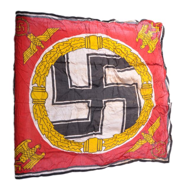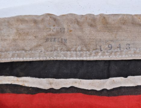 A WWII Second World War related German Third Reich Nazi Party ' Fuhrer Standard ' Adolf Hitler linen flag. The seam dated 1943 with makers marks for Schutz, Berlin. Black and white border, with large central wreathed swastika motif and imperial eagles to corners. Origin unknown. Measures approx 84x96cm.