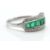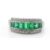 A platinum emerald and diamond ring. The ring set with a central band of emeralds with two bands of brilliant cut diamonds within a pierced gallery mount to plain shank. Weight 4.2g. Size L
