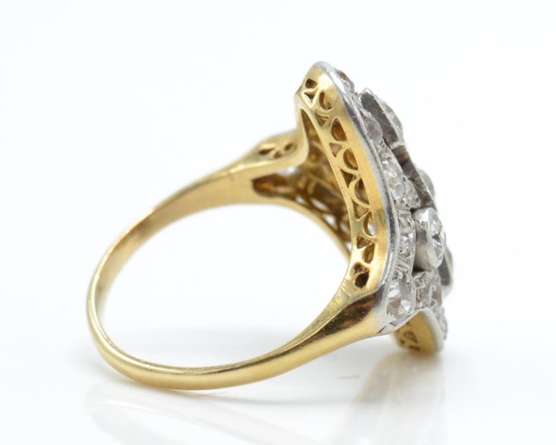 A 14ct gold and diamond panel ring. The ring having a pierced quatrefoil diamond set panel to plain shank. Estimated diamond weight 1.0cts. Total weight 5.2g / Size J