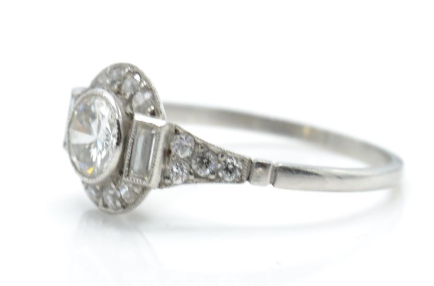 An Art Deco platinum and diamond ring. The ring set with a central round brilliant cut diamond flanked by 2 baguette diamonds having pave set diamond shoulders with plain shank. Estimated principle diamond weight 0.50ct. Total weight  3.0g / Size O