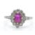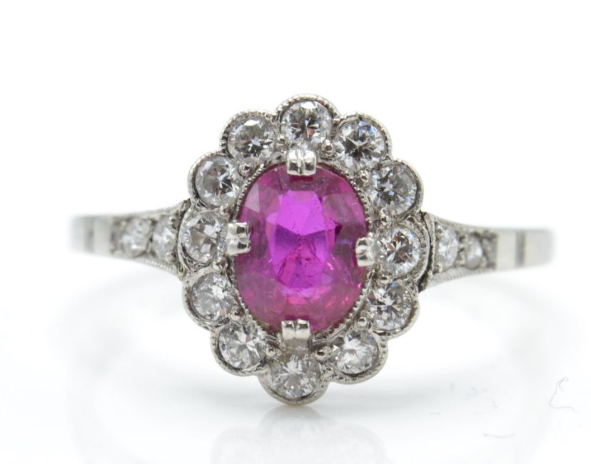 An 18ct white gold ruby and diamond ring.  The ring with a central oval mixed Burmese ruby surrounded by a halo of brilliant cut diamonds to raised diamond set shoulders and plain shank. Total weight 2.2g / Size K.5