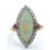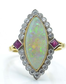 A French 18ct gold opal diamond and ruby ring. The ring set with a marquise opal cabochon surrounded by a halo of diamonds having prices cut ruby accents. French assay marks to shank - Tests 18ct gold. Size N. Weight 5g.