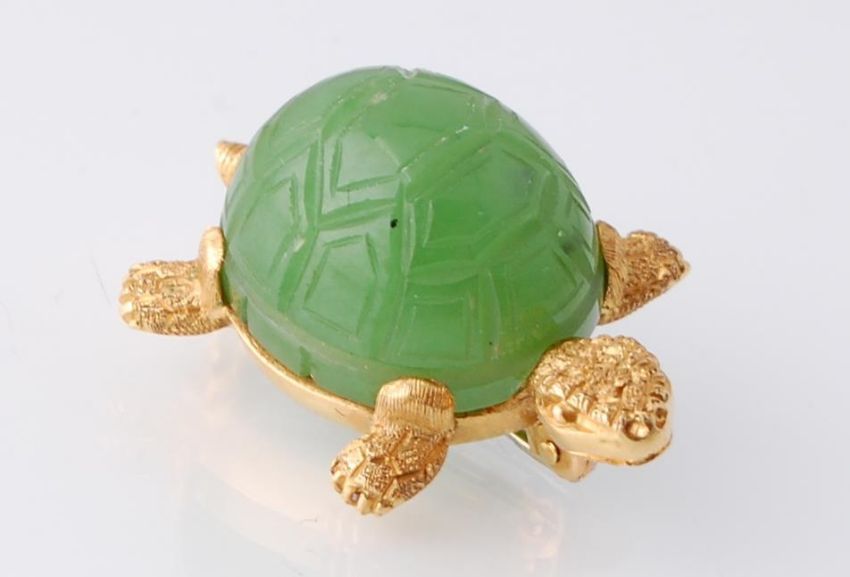An 18ct gold French novelty brooch. The brooch in the form of a turtle having a carved green cabochon shell and completed with roller clip clasp. The brooch marked 750 plus another mark to foot - see images.  Measures approx 1 inch. Weight 7.2g.