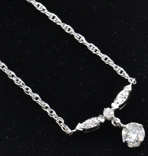 A 14ct white gold and diamond pendant necklace. The necklace strung with a brilliant cut diamond drop surmounted by diamond set foliate links and  united by rope twist chain to spring hoop clasp. Estimated diamond weight 0.70ct. Total weight 4.1g / Size
