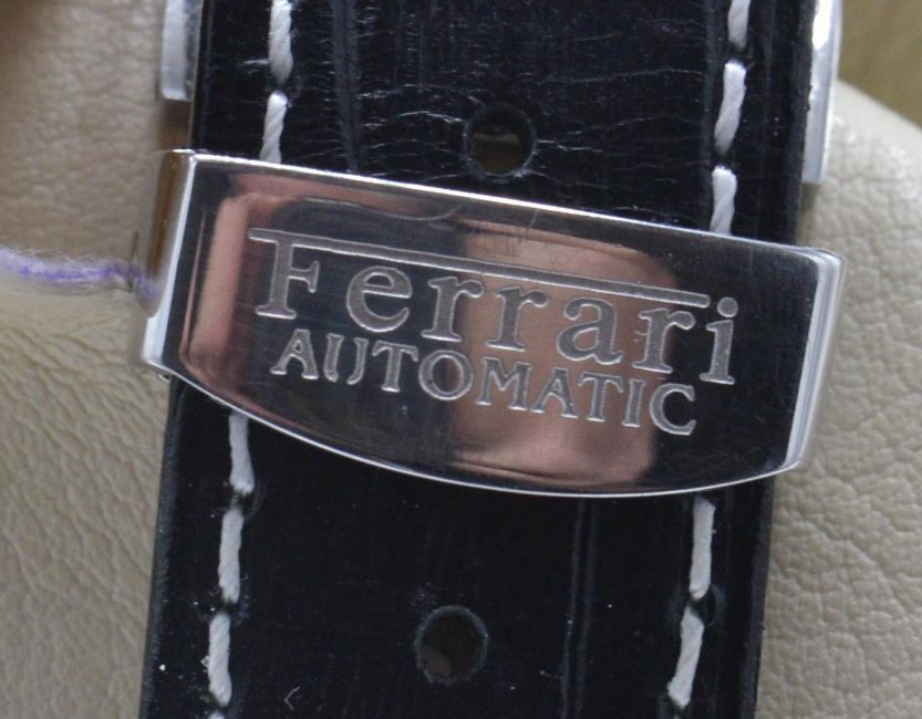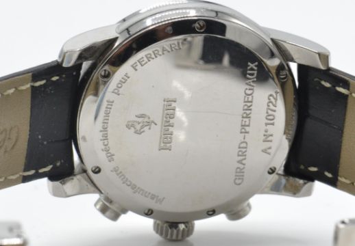 Rare late 20th century Girard Perregaux for Ferrari F300 Chrono wristwatch. Ref 8020 Auto 57 jewel movement. Chronodial 28,800bph produced in limited numbers between 1994 - 2004. This model used to celebrate the new F300 car used in 1998. Both boxes and service document 9/18 £852.00 2 x straps and strap tool unusually signed single for clasp.