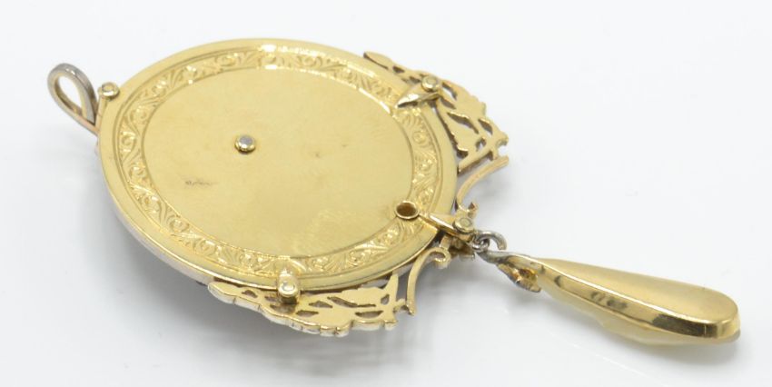An Art Deco onyx diamond and mother of pearl necklace pendant. The pendant strung with a blister pearl drop suspended from a monochrome onyx and mother of pearl decorated roundel with diamond embellished garlands. All within a millgrain mount. The pendant having engraved decoration verso. Weight 20.5g / Measures 7.25cms drop