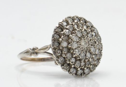 A white gold and diamond cluster ring. The ring set with a large diamond set cluster of concentric form. Total weight 7.5g / Size Q.5