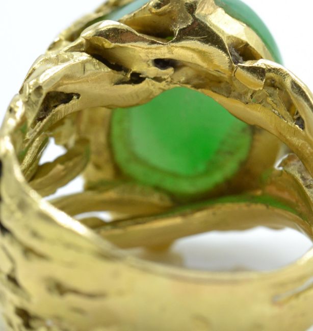 A  French 18ct gold wirework jade ring. The ring being formed in a wirework naturalistic design encasing a large Jade cabochon. French eagle mark and sponsor mark to outside of shank. Total weight 18.5g. Size S.