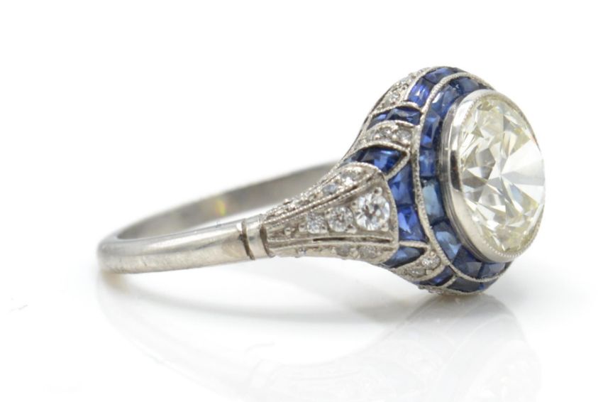 An Art Deco platinum diamond and sapphire ring. The ring designed in the Art Deco style set with central round brilliant cut diamond surrounded by calibrated set blue sapphires having diamond and sapphire shoulders to plain tapering shank.  Marked with estimated diamond weight  to shank  2.48ct - measures 8.4mm diameter and 5.9mm depth. Estimated clarity VVS - VS. Total weight 5.9g. Size O.