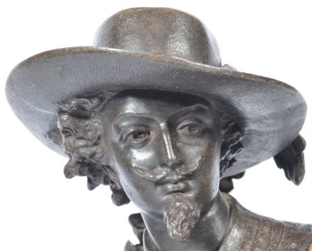 Manner of Philippe Poitevin  An antique late 19th century French spelter freestanding sculpture / figure form of a Gentleman Cavalier . The well detailed figure raised on a circular socle plinth base. Measures 94cm high