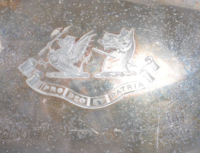 A 19th Century English antique Military interest silver plated kipper bowl bearing the Coat Of Arms for the Army Chaplain Corps. Ovoid form with metamorphic lid raised on reeded body and legs with ball and claw feet. Measures: 38cm wide.