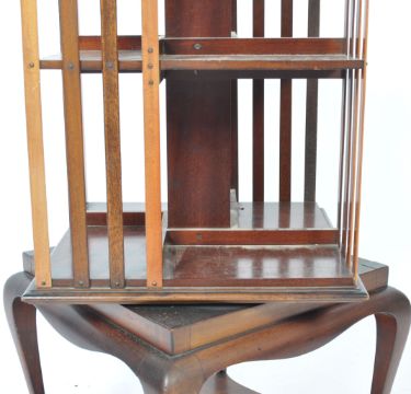 An Edwardian mahogany revolving library bookcase on stand of rare smaller proportions. Raised on cabriole legs with pad feet to the stand united by lower tier. Above, a revolving bookcase with slatted sides enclosing the sectional interior. Measures 85cm x 40cm x 40cm