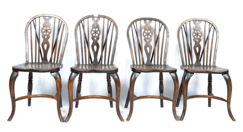 A arre set of four early 19th Century English antique beech and elm Windsor kitchen dining / side chairs having a wheelback backrest with rails over carved saddle seats having cabriole legs united by crinoline stretcher. Lovely period examples. Measures: 92cm x 40cm x 40cm.