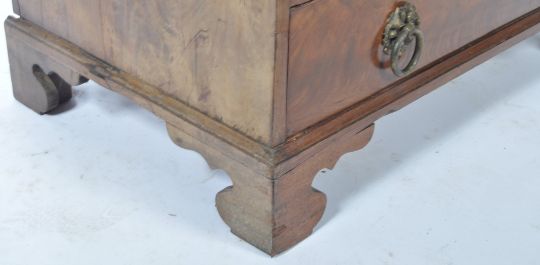 An 18th century George III mahogany line inlaid bachelors chest of drawers. Raised on bracket feet with bank of four drawers having large brass ring handles on repousse brass back plates. Above, a flared top with satinwood inlaid border. Measures 80cm high x 91cm width x 56.5cm depth