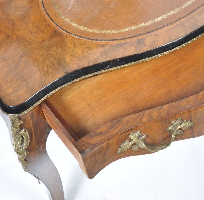 A late 19th century ladies bonheur du jour, writing table desk constructed of  burr walnut veneers and kingwood banding all set with stunning inlaid marquetry detailing. The raised gallery back having central mirror door cabinet flanked by banks of drawers fitted cast brass handles and ormolu mounted embellishments. Finished with an oval tooled leather inset above a frieze drawer, on cabriole legs with gilt brass ormolu mounts. H119 x W117 x D72cm