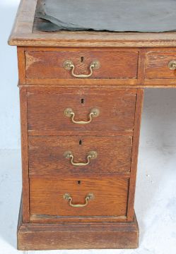 An early 20th Century oak pedestal office / library desk having a green leather top with three drawers to the frieze each having locks and brass swing handles, raised on two banks of three drawers all with matching handles and locks. Leather in need of some repairs. Measures 78x137x77cm.