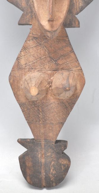 A group of three African tribal carved fertility figures / wall plaques having elongated faces with shaped head dresses on diamond shaped bodies.
