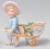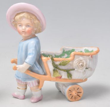 A 19th Century Victorian Staffordshire pottery sponge decorated creamer jug in the form of a cow, a Victorian child's tea service having pink transfer printed decoration to the sides, two antique bisque figurines and a ceramic figurine of a child pulling a cart. Measures 13cm tall.
