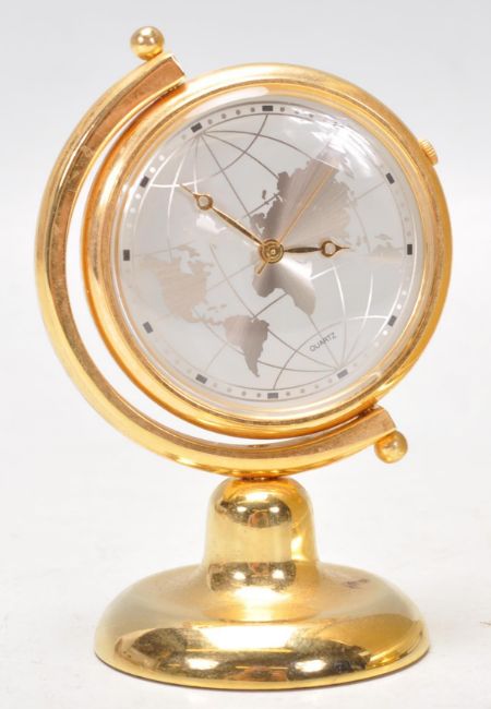 A vintage 20th Century brass cased carriage clock by President having gilt brushed design interior with silvered roman numeral chapter ring and a group of three miniature brass clocks.